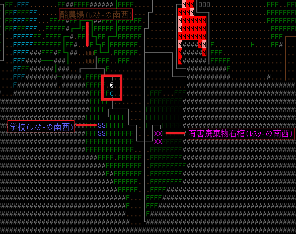 というわけで楽々と有害廃棄物石棺の中に入り込みました。この施設は大きく分けて水色の四角で囲んだ小屋と、赤色の四角で囲んだ建物の2つに分けられている。まずはアイテムが置いてある赤い四角の建物を調べようかなあ。