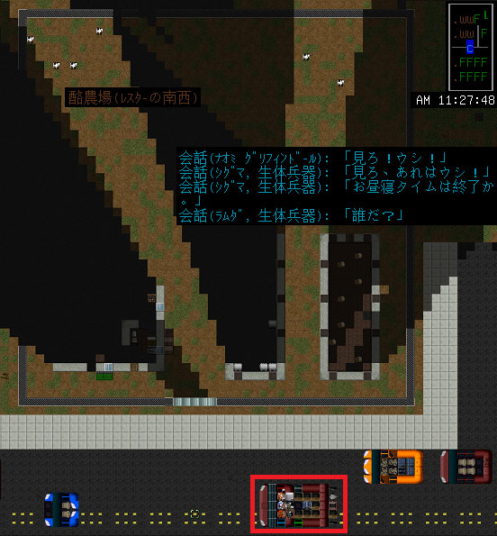 道路の自動車からガソリンを回収しつつ酪農場に突入します。予想していたよりもウシの数が多くて絶景だ。俺はCataclysmDDAで酪農をしたことがないからチョット緊張している。