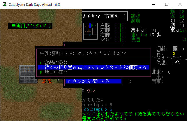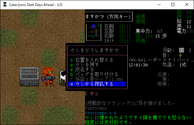 ペット化したウシに『e』コマンドを使うと上の選択肢が表示されます。犬のときと同じような選択肢ですね。名前をつけることも出来るんだってさ。犬と違うのは『搾乳』が可能な点だろう。