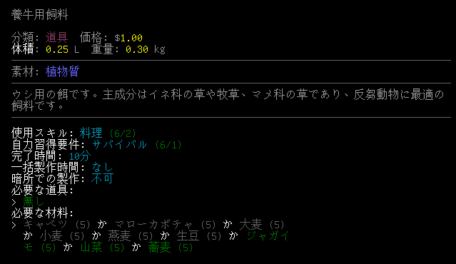 救急車に戻ったら養牛用飼料を作れるようになった。たぶん何かの学習本にレシピが載っていたのでしょう。スキルの難易度が低いうえに使用する道具すら不要なクラフトです。小型冷凍庫の中に山菜が20個あるから材料にしますね。