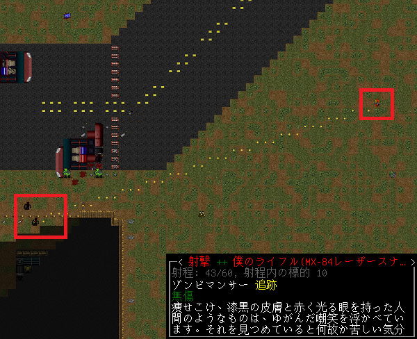 牛を戦闘に巻き込むとまずいので少し左側に移動します。それでは危険なゾンビマンサーから狙撃していこうか。ゾンビマンサーを全滅させないと倒しても倒しても復活する無限ループに陥るからな。