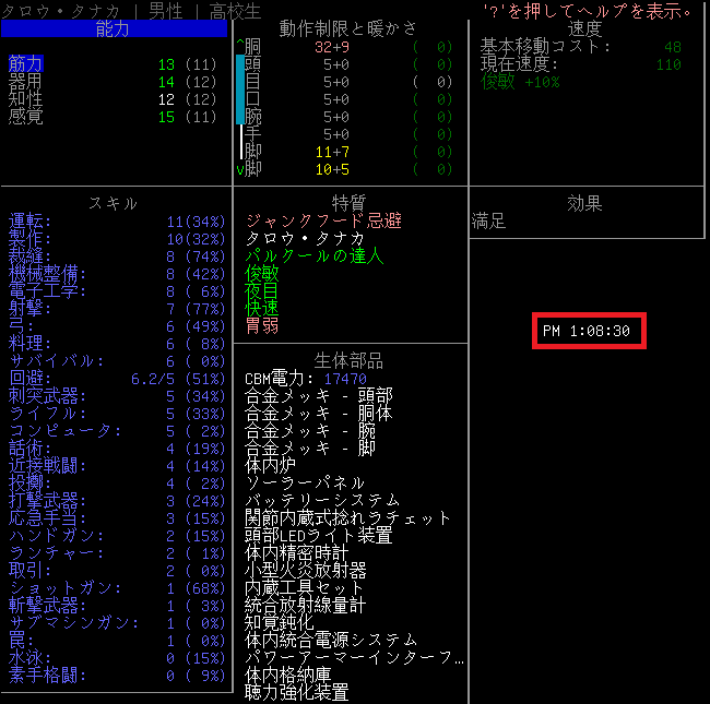 現在の能力値は上の画像。時刻はPM1:08になった。酪農場に仲間と休息できるベッドがあるか調べたかったのになあ。もしも酪農場にベッドが無ければそろそろ高層マンションに戻る準備をした方がよろしい。