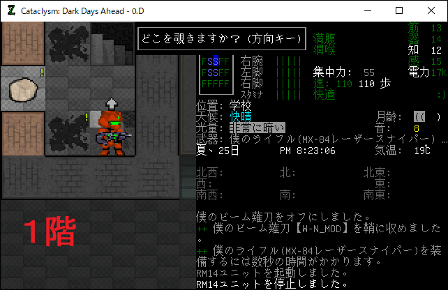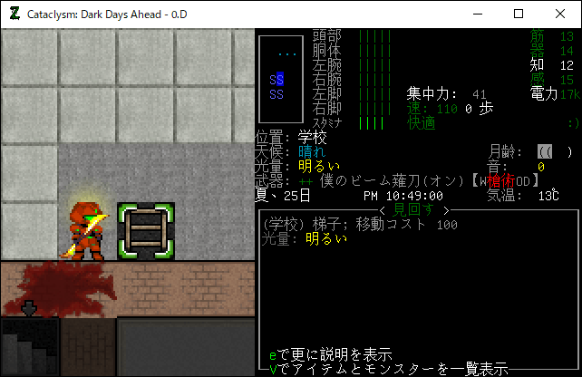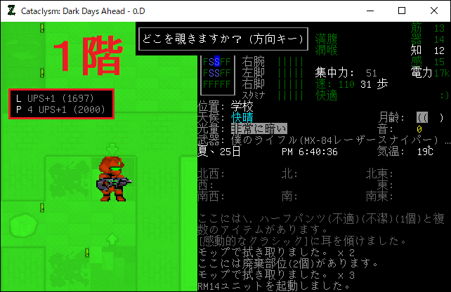 Cataclysmのプレイ日記を始めます。レスター南西にある学校の1階を制圧しました。ゾンビは全滅したけどアイテムの回収をしていません。戦利品の物色は全ての階層を制圧したらやります。