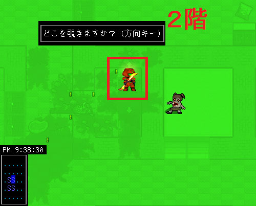 アイテム回収は全ての部屋を制圧してから行うぞ。地上に戻って2階に攻め込む準備をしましょう。また透視をしながら『X』コマンドで覗きますね。