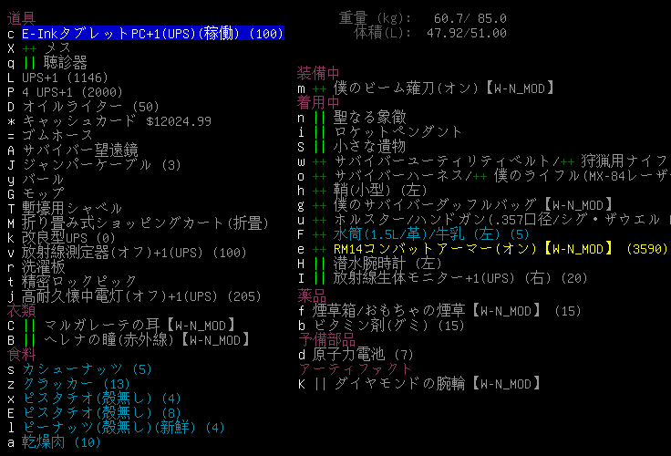 今回の投稿はここで終わりにします。現在の所持品と装備品は上の画像。レーザースナイパーの使用は控えたのでUPS電力はそれほど減っていません。つーか、カートを持ったまま歩いていたのにいま気づいた。
