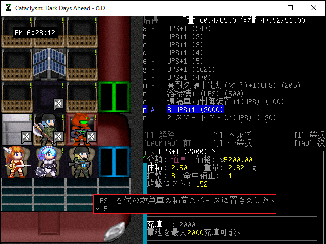 現在、保持しているのUPS電力は500だけです。レーザースナイパー5発分しか残っていません。これでは戦えないので充電されたUPSと交換しましょう。いったん救急車に戻って補給することにします。