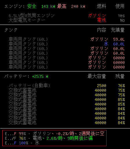 空っぽのUPSを一気に5個も充電したからバッテリーの残量が心配だ。現在のガソリンとバッテリーは上の画像。少しずつだがバッテリーは増加しているみたいだし大丈夫か。ガソリンエンジンとオルタネータのおかげで発電量が増加しているからな。
