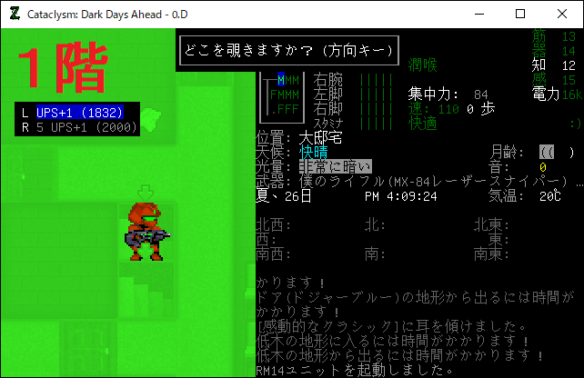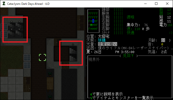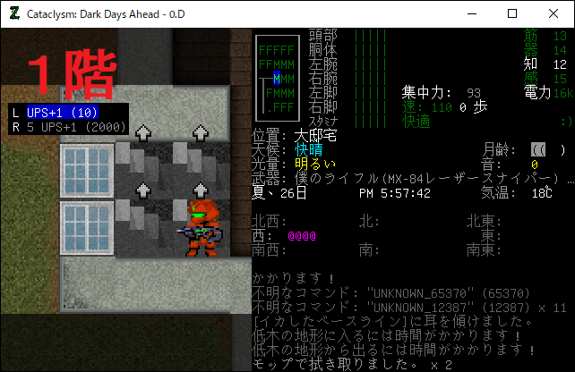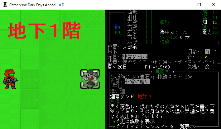 Cataclysmのプレイ日記を始めます。大邸宅の1階を制圧しました。今回のプレイ日記も大邸宅の探索をします。この大邸宅には地下室や上階があるからな。