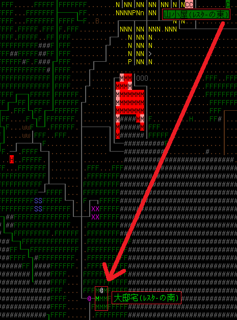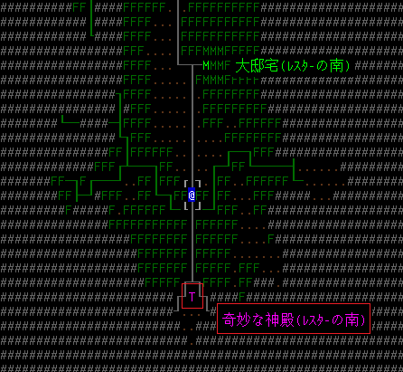 全体マップを確認してみたところ、もう少し南に行くと『奇妙な神殿』があるようです。うーむ、T字路に妙な施設が生成されたようだ。いつになったら本命の科学研究所を発見できることやら。