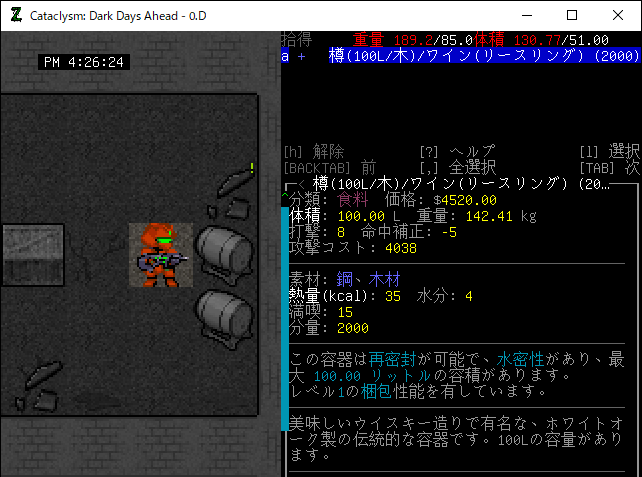 ワインで満タンになった100リットルの樽を発見したぞ。酒ってRP以外にメリットがあるのかね。0.D安定版ばかりプレイしている自分には酒を有効に活用する方法が思い浮かばない。健康度が下がりそうだし0.F安定版でも飲まない方がよろしいのかな?