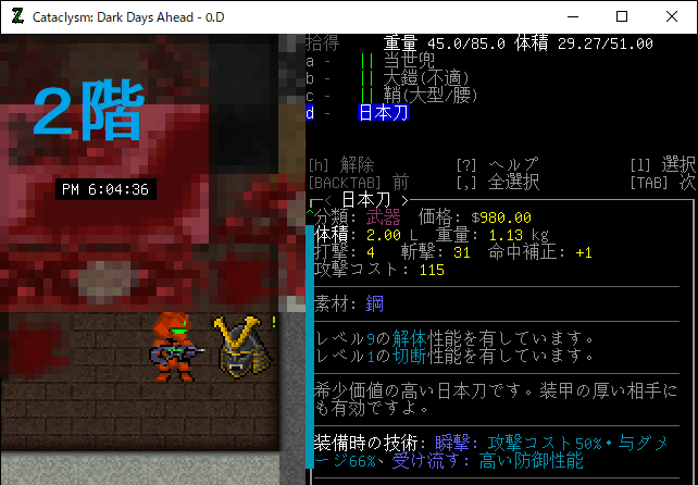 2階にて日本刀と日本の大鎧を発見しました。日本刀はレプリカではなく本物だぜ。大邸宅の主人がコレクションとして武具を収集していたんだね。CataclysmDDAは住人の個性を演出するような細かいネタがあるから面白い。
