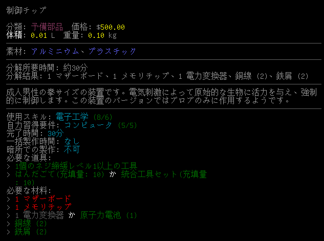 この学習本で重要なのはスキル上げではなく、レシピなのだろうな。というわけで書かれている4つのレシピを全て調べてみることにしました。4つのうち1つは上の『制御チップ』です。制御チップは次に貼るアイテムの材料であり、こいつだけを使用しても意味はない。