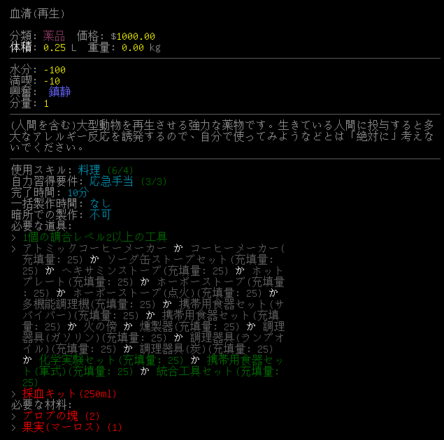 最後のレシピは『血清(再生)』です。デバッグモードで実験したんだけどよくわからないアイテムだった(笑)。もの凄い沈静作用があるのは間違いないようだ。その代わりに酷い副作用があるようだけどね。