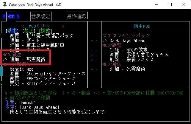 導入の手順はsaveフォルダのmods.jsonに『"necromancy"』を書き込むだけです。既存の世界にMODを追加するのは危険なので真似しないでください。俺だって本当はこんな無茶をしたくはなかった。