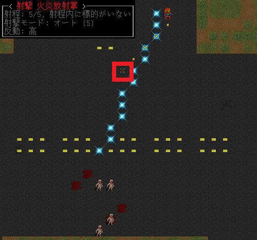 今のままだとジリ貧なので戦術を変更します。敵の大群に有効な攻撃手段は炎だろう。CBM: 火炎放射掌で周囲に炎の壁を作ろう。射程が5と短いけどホムンクルスは真っ直ぐこちらに向かっているし俺の目の前に炎を発生させれば必ず突っ込んでくれる。