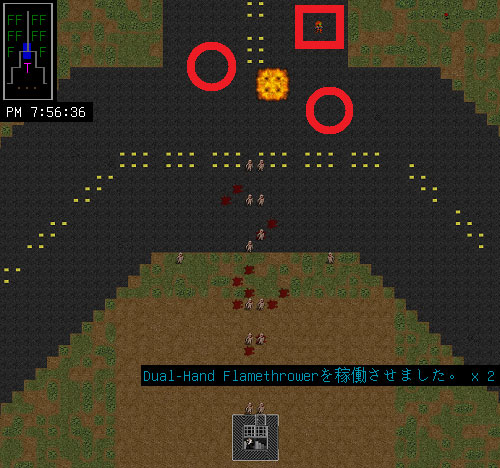 火炎放射掌により俺の左下に炎を発生させました。まだ敵と炎のあいだに距離があるからホムンクルスを焼くことはできない。次は赤い丸の位置に火炎放射掌を撃てば、炎の壁が完成して敵が全滅すると思うんだけどな。