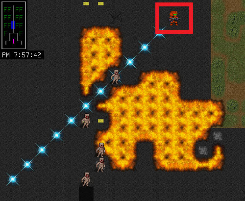 この時の戦場は上の画像。赤い四角で囲んだホムンクルスが俺に隣接して攻撃したのだ。まさか炎の壁を越えて俺の隣に来るとは思わなかった。吹っ飛ばされた衝撃で『転倒』状態になったのはヤバいね。転倒の状態異常があると、まともに銃器を撃てなくなるのだ。