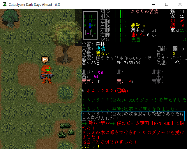 あれ?レーザースナイパーを撃っていたらタロウ・タナカが森林の中に吹っ飛びやがった!何が起きたのかログを確認したところホムンクルスに吹き飛ばされたようです。ちょっとシャレにならないダメージと苦痛をもらっちまった。ホムンクルスはゾンビと比較にならないくらい強いぞ。たぶん3~4体のホムンクルスに囲まれたら殺される。