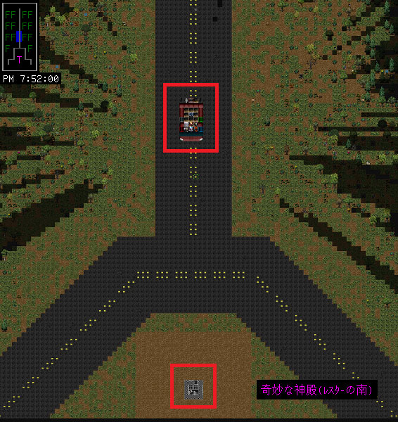 現在地は大邸宅の南にある道路だ。長い1本道を走行していたら『奇妙な神殿』を発見したんだよね。奇妙な神殿は地下に降りなければ無害なので無視して通り過ぎよう。