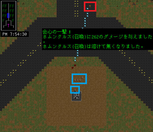 金網の北側を拡大した様子は上の画像。このホムンクルスは名前に『召喚』と書かれているから魔法で作られたのか?厄介なことに敵対状態になっていやがる。どうやら穏便に話し合いをするのは無理そうだな。