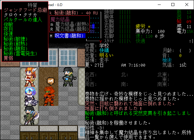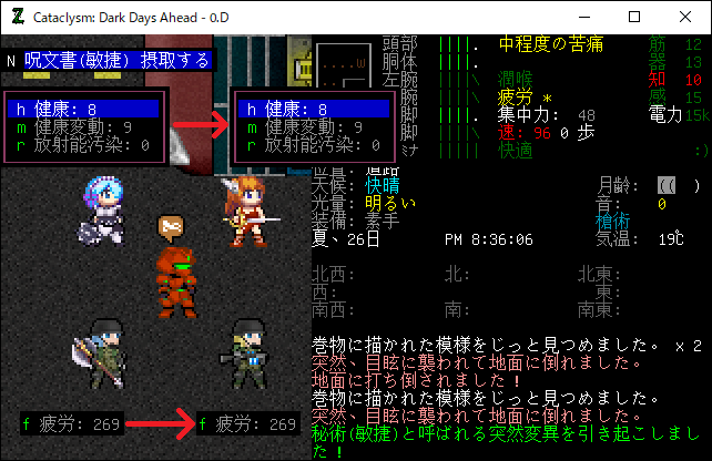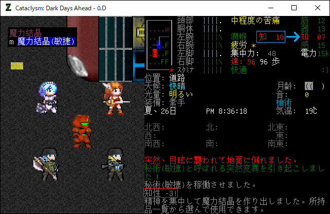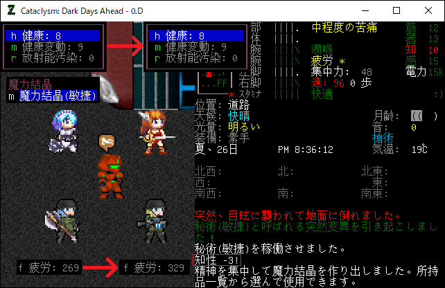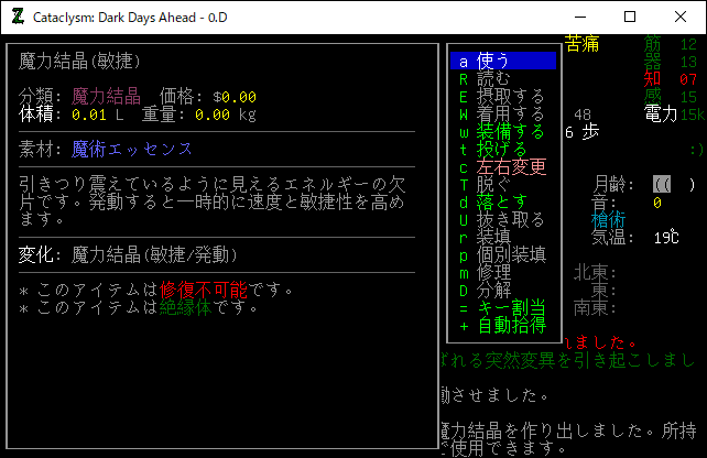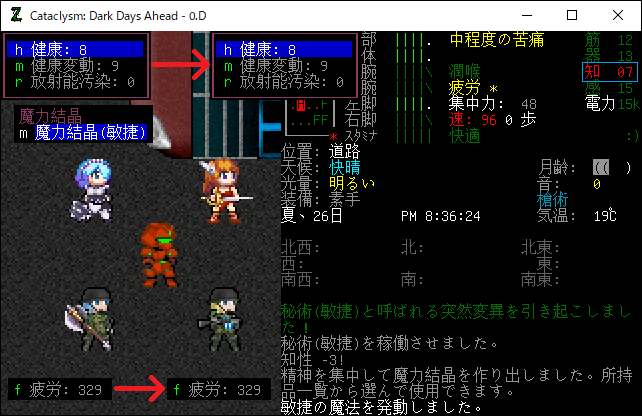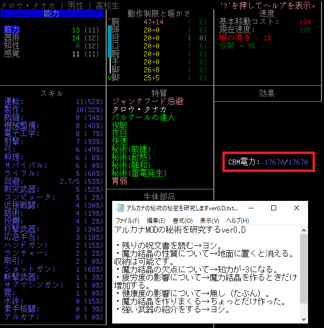 Cataclysmのプレイ日記を始めます。0.D安定版に『アルカナと魔道具MOD』を導入しました。今回はアルカナMODの秘術や魔力結晶の仕様を研究します。デバッグモードで健康や疲労への影響などを調べてみましょう。