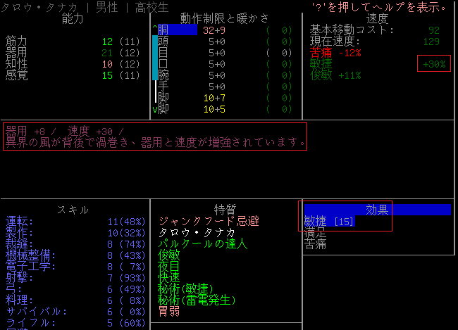 この時の能力値は上の画像。魔力結晶(敏捷)の効果を正確に書くと『しばらくのあいだ器用+8、速度30%アップ』になるというものだ。苦痛により速度が低下したら使ってみようかな。
