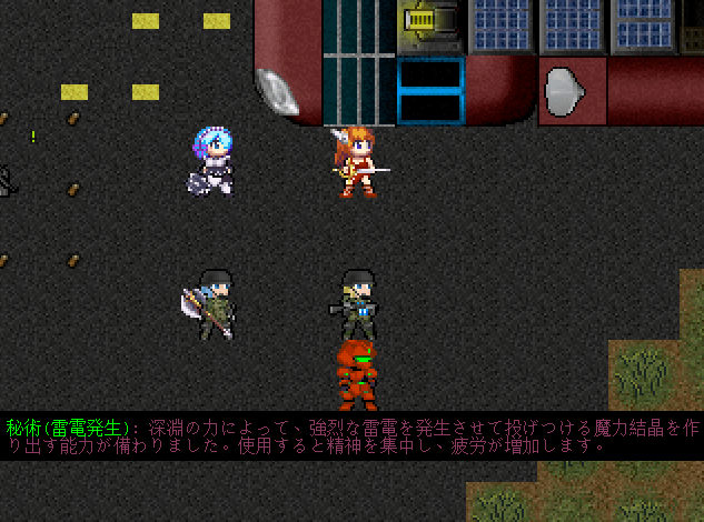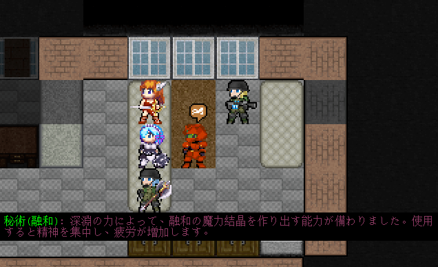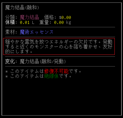 よくわからないままではマズいので魔力結晶(融和)の説明文を読みます。どうやら近くにいるモンスターを友好的にする効果があるらしい。永久に友好的になれたら最強だけど数ターンで効果が切れる。それでもすごい便利なことには変わりないけどね。ただし、何十体もの敵がいる地上では役に立たないかな。出番があるとしたら地下室だろう。