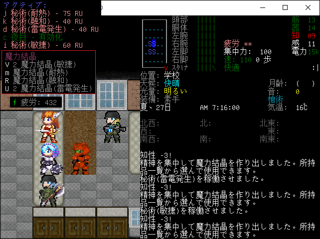 敏捷の時と同じように魔力結晶(耐熱)を作ってみました。疲労が404になって非常に危険な状態になってしまった。戦場で魔力結晶を生成しまくったら疲労困憊になって殺されるよな。前もって大量の魔力結晶を用意しておくのが正しい利用方法だ。