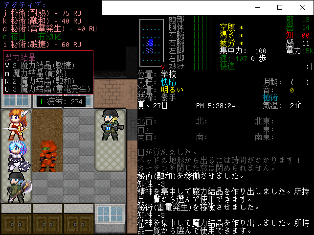 今回は画像の枚数が多いので移動時のキャプチャはカットした。学校の2階に到着したので仲間と一緒に休息しましょう。バッグの中には1個の魔力結晶が入っています。健康は8、健康変動は9のようです。健康の値が減少するか観察します。