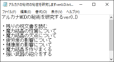 秘術の仕様を理解しないまま戦闘に向かうのは無謀だな。というわけで今回調べておくべき事をメモ帳にまとめておきました。調査した結果は最後にまとめて公開します。現行のアルカナMODとは異なるかもしれないので注意してください。調べる過程にてデバッグモードのデータをプレイ画像に貼りまくったので見づらいと思う。