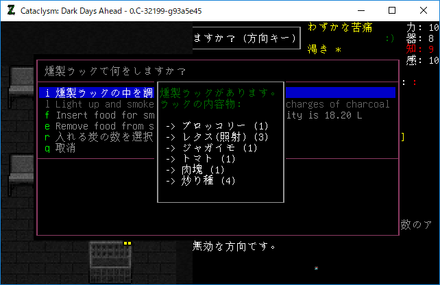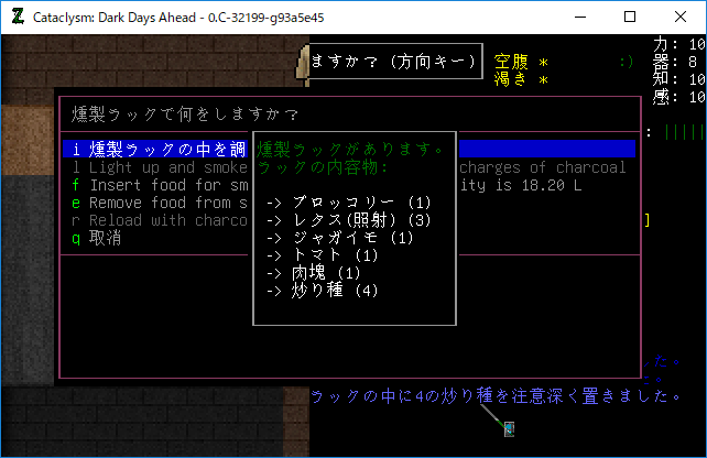 燻製ラックの使用は『e』コマンドを押して実行です。ラックに吊した食料は上の画像。このまま放置すれば乾燥するのかな?しばらく様子を見ましょう。