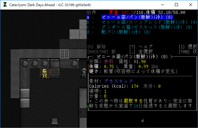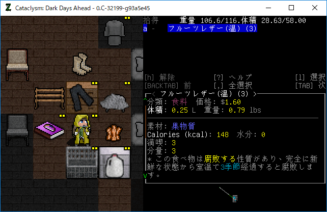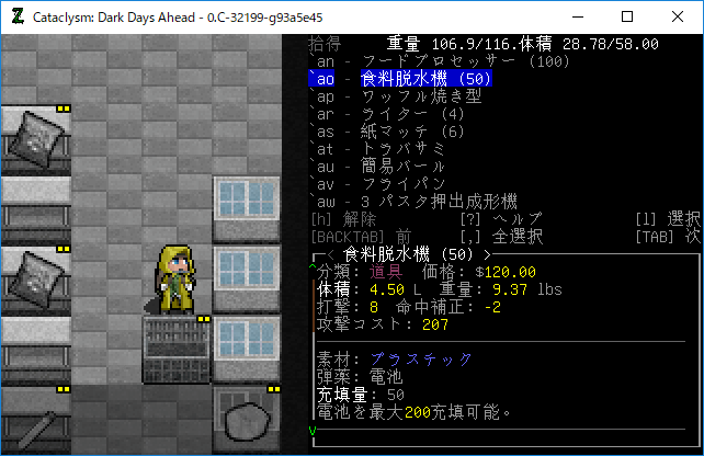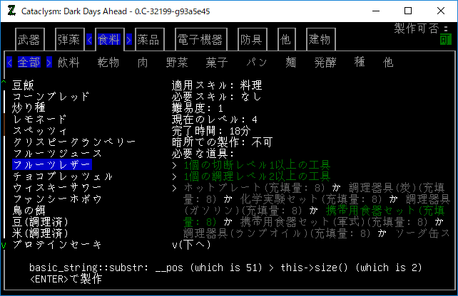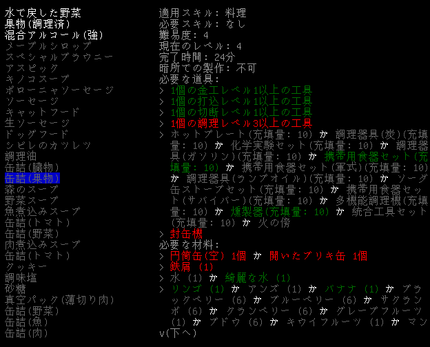 Cataclysmのプレイ日記を始めます。世界が崩壊して10日が経ちました。食料品店の商品が全て腐る前に賞味期限を延ばすクラフトを実行しています。食料脱水機を使って乾燥野菜やドライフルーツをいくつか製作しました。