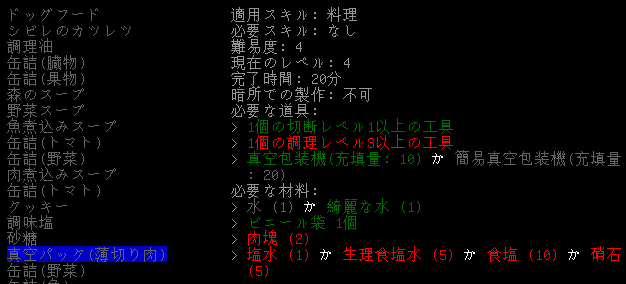 真空パックや缶詰を製作できません。賞味期限を延ばすクラフトとして期待をしていたのに残念だ。ここで携帯用食器セットが調理レベル3の工具ではないのに気づきます。過去の投稿を修正しました。