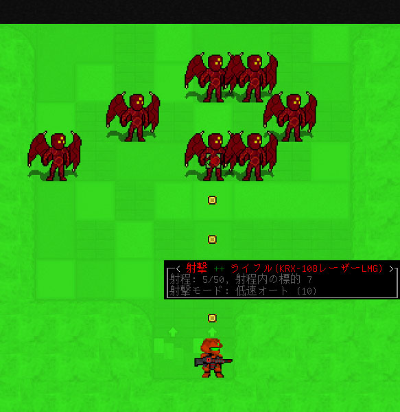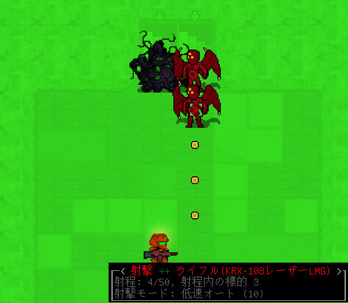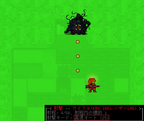 全ての肉天使を倒して残る敵はジョゴスだけになった。距離は4タイルしか離れていないけど射線が通ったぞ。ショゴスは体力が多いので射撃モードを『高速オート(25)』に切り替えよう。どんなにタフな野郎でも25発のレーザーを撃ち込めば地獄の入口でミノスに泣きつくことになるさ。