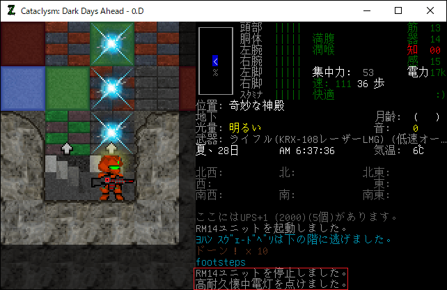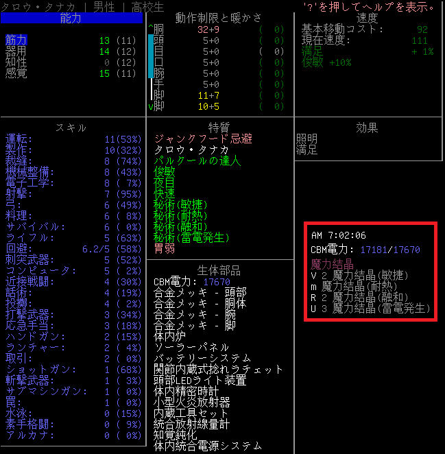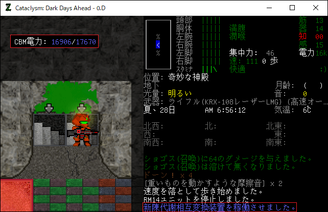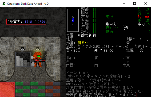 奇妙な神殿ではCBMを多用することになるだろう。移植したCBMの効果を忘れてしまったので再確認してみました。今回はCBM:新陳代謝相互変換装置が役に立つかもね。このCBMは空腹度をCBM電力に変換する効果があります。稼働すると5ターン毎にCBM電力が25ほど回復しました。つまり1時間でCBM電力が3000も充電されるのだ。