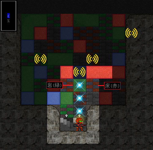 現在の戦場は上の画像。地下1階は不規則に配置された壁(岩)と床で構成されていました。さらに岩と床は『赤、青、緑』の3種類があるようだ。透視をしていないと壁の向こう側にいる敵は見えません。