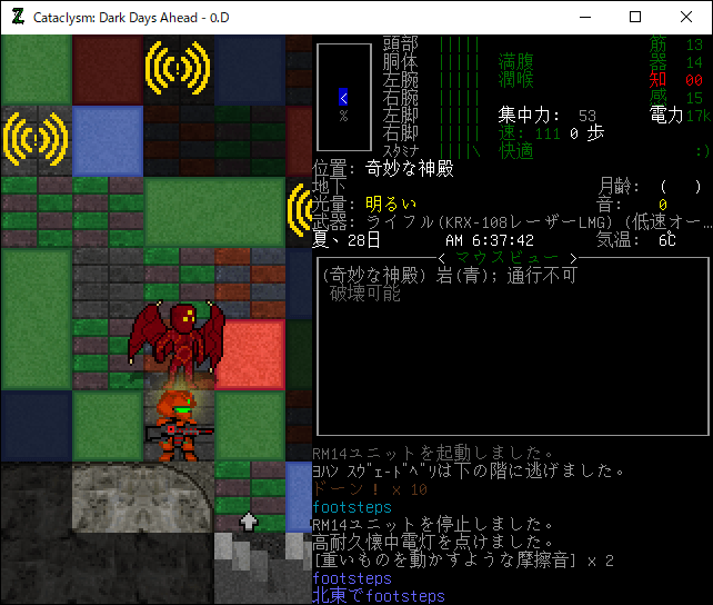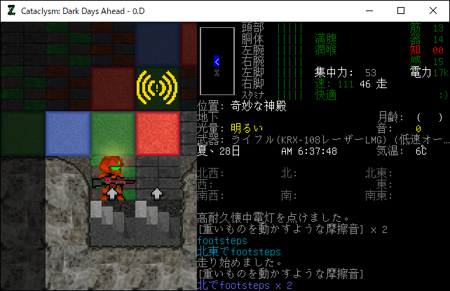 Cataclysmのプレイ日記を始めます。地上の敵はいなくなったし所持品の整理が終わった。これより奇妙な神殿に攻め込みます。俺は奇妙な神殿を探索したことがありません。今回が初挑戦になるので緊張しています。