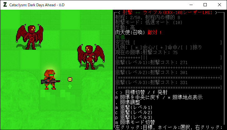 やべえ!いつの間にか先ほどとは別の敵が近くに来ていやがった。移動できる場所は右側の床か下側の階段しかありません。敵との距離はわずか2タイルだ。銃器で戦うには敵と近すぎて危険だ。しかし、f→c(狙撃レベル2)なら発射できるかもな。まだ俺は肉天使を討伐していない。せっかくなので2タイル離れていれば倒せるのか試してみようぜ。無理なら階段から地上へ逃げればよろしい。
