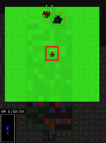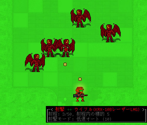 よしよし、f→cの射撃で肉天使の撃破に成功した。2タイル離れていれば撃破は可能みたい。まぎらわしいが、いま倒した敵と同じ場所に新手の肉天使が現れやがった(上の画像)。こいつも同じように撃ち倒します。