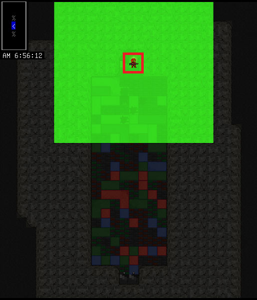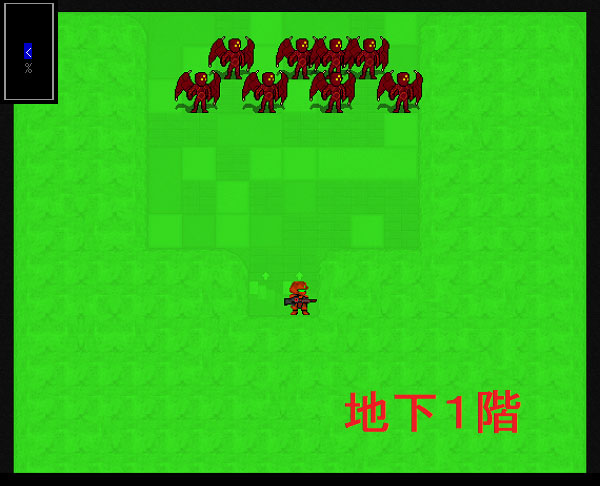 地下1階を覗いてみました。画面が緑一色なのでよく分からない状況だな。地下1階は階段の北側に広い部屋がある。それに初めて遭遇したであろう8体のモンスターがいます。いまのところ判明したのはこれくらいかな。