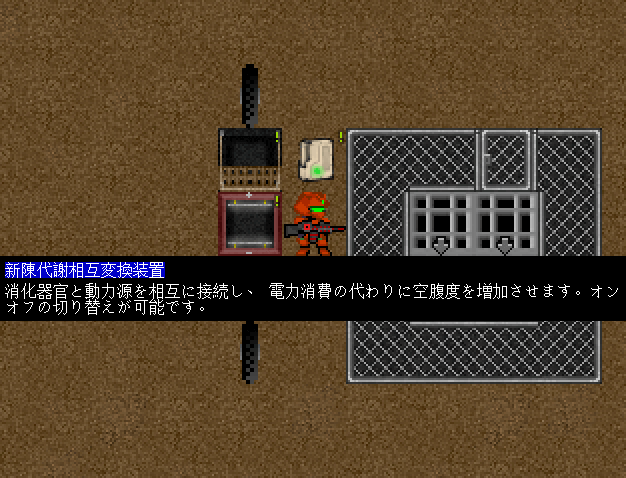 CBM:新陳代謝相互変換装置は稼働中に空腹度が増加します。長時間稼働できるように食料を多めに持って行こうぜ。現在、所持してい食い物はカシューナッツとクラッカーだけなので頼りない。