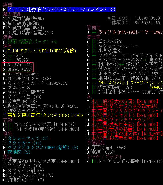 今回のプレイ日記は地下1階を制圧したところで終わりにします。現在の所持品と装備品は上の画像。地下1階を攻略するだけで4個のUPSが空っぽになった。KRX-108は強いけど燃費が悪すぎるなあ。このまま地下2階に降りたら戦闘中にUPS電力が尽きる。改良型UPSに原子力電池を装填しておかないとね。
