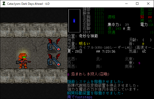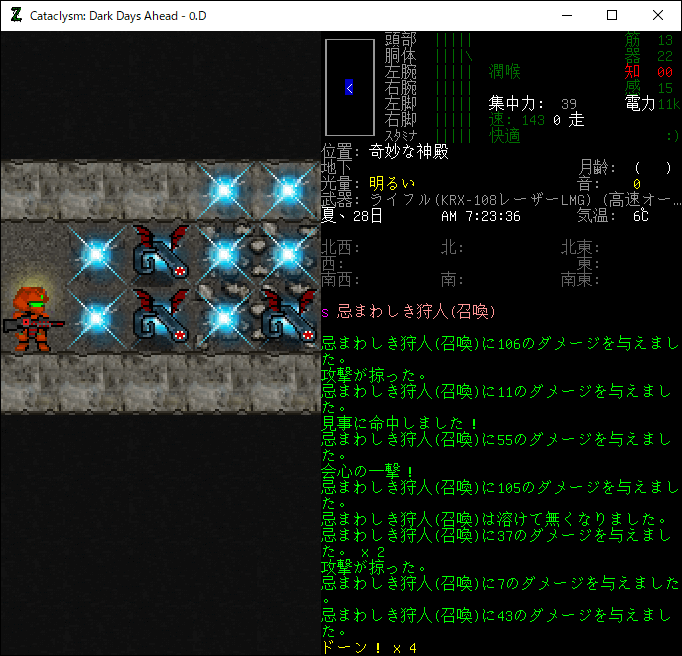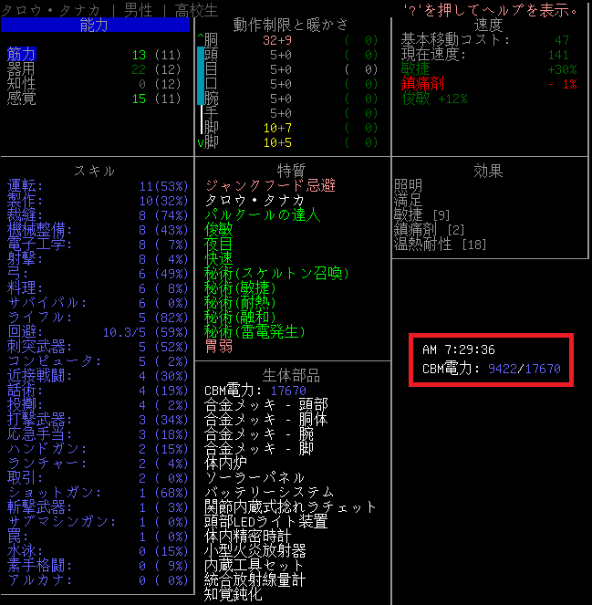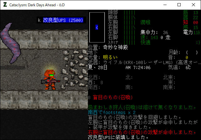 どこからか出現した盲目のものにぶん殴られたが改良型UPSを充電することができました。瀕死の重傷を覚悟したけど軽傷で済んだようです。敵に襲撃されながらも充電できたのは敏捷の秘術で加速していたおかげだな。CataclysmDDAにおいて速さと強さは同義だ。