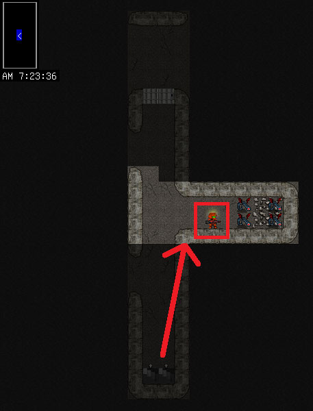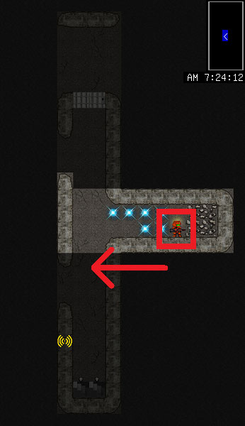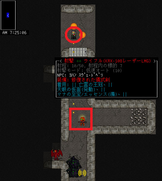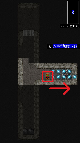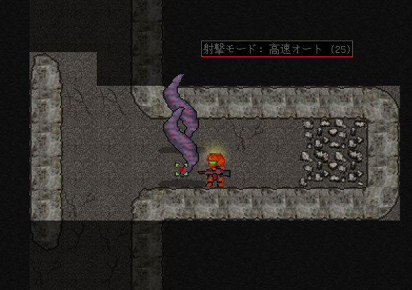 忌まわしき狩人を撃破した直後の俺は上の画像。いまのところ視界の中に敵はいません。改良型UPSが空っぽなのに何度も25連射を放ってしまった。はやく改良型UPSに原子力電池を装填しよう。原子力電池を装填している最中はターンが経過するから怪物に襲撃されるかもしれない。1発くらいは怪物にぶん殴られても構わないと覚悟を決めようか。