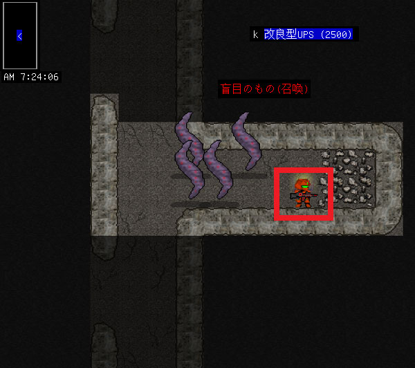 もうショゴスの包囲から脱出する方法はテレポートしかないのだから運否天賦でワープしようぜ。というわけでCBM:瞬間移動装置を稼働させた直後の俺は上の画像。どうやら忌まわしき狩人のいる細い道にテレポートしたようだ。もう少し敵の位置が離れていれば改良型UPSを充電できたのになあ。
