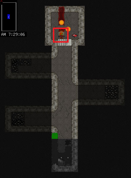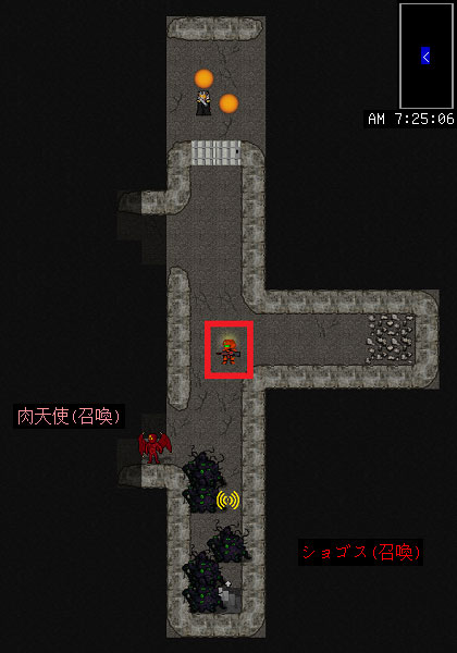 現在の戦場は上の画像。灼熱の地下4階から降りたところショゴスの大群に囲まれてしまった。脱出の方法は後で考えよう。というか北側に見える人影は召喚師のNPCだよな。