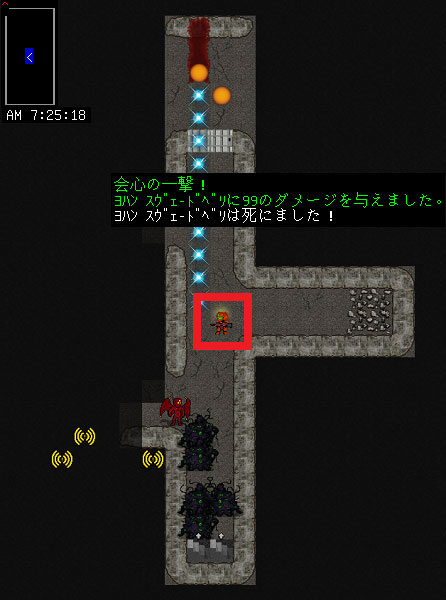 よーし!予想どおりレーザーが空洞の中でメチャクチャにまき散らされた!敵の集団に満遍なくダメージを与えながら1体倒すことができたよ。しかも加速中なのでターンは経過していない。敵の集団が近くにいる場合はわざと下手くそなf→a射撃をするのがベストなのだ。この戦法は地下1階で花びらみたいなレーザーの射線を見て思いつきました。