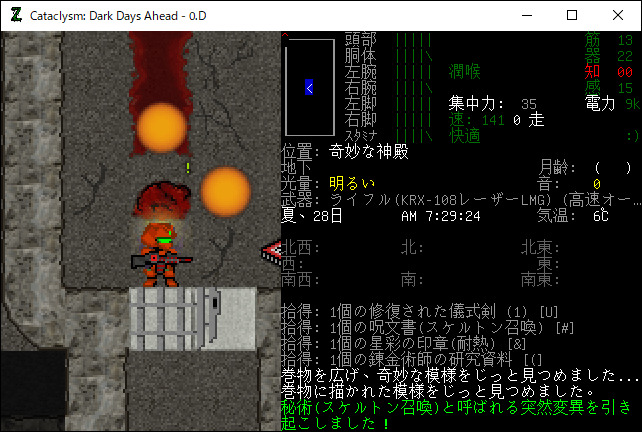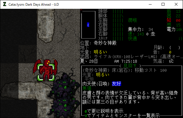 Cataclysmのプレイ日記を始めます。奇妙な神殿の地下5階に到達しました。地下5階は神殿の最深部になる。怪物の集団をぶっ倒して召喚師のNPCと決着をつけるぞ。