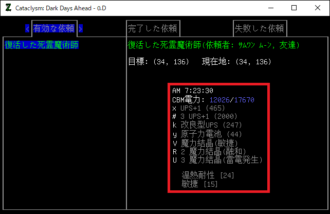 現在の有効な依頼は上の画像。いまだにクエストの名称である『復活した死霊魔術師』の意味がわからない。まあいいや、現在の物資を確認しよう。CBM電力や魔力結晶は温存してきたので充分にあります。しかし、改良型UPSの電力が247と少ないのは心配だな。多少のダメージは覚悟してどこかで原子力電池を装填しないと戦闘の継続が不可能になるね。