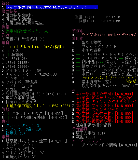 今回の投稿はここで終わりにします。現在の所持品と装備品は上の画像。奇妙な神殿で消費した原子力電池は35個だった。俺が貯め込んでいた原子力電池の約半数を失ってしまったよ。CBM電力が減ったので学習本を体内炉に入れてしまおうかなあ。ぶっちゃけ読んだことのない学習本ばかりだし、これからも読むことはなさそうだ。